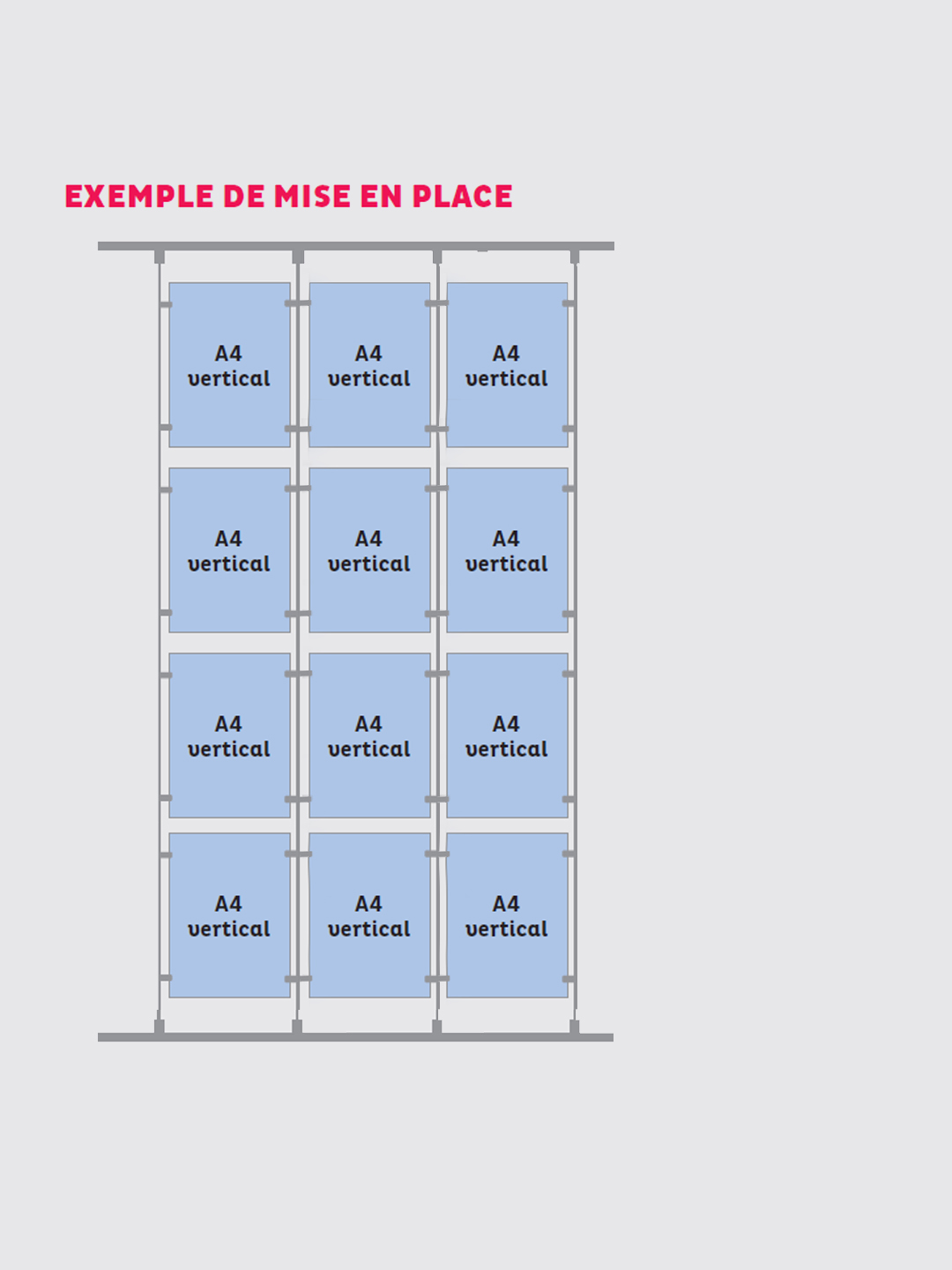 • Composé du cadre autoportant + 12 porte-affiches 091222 + 4 kits câbles 091401 + 12 pinces double 091404 + 32 pinces simples 091402.