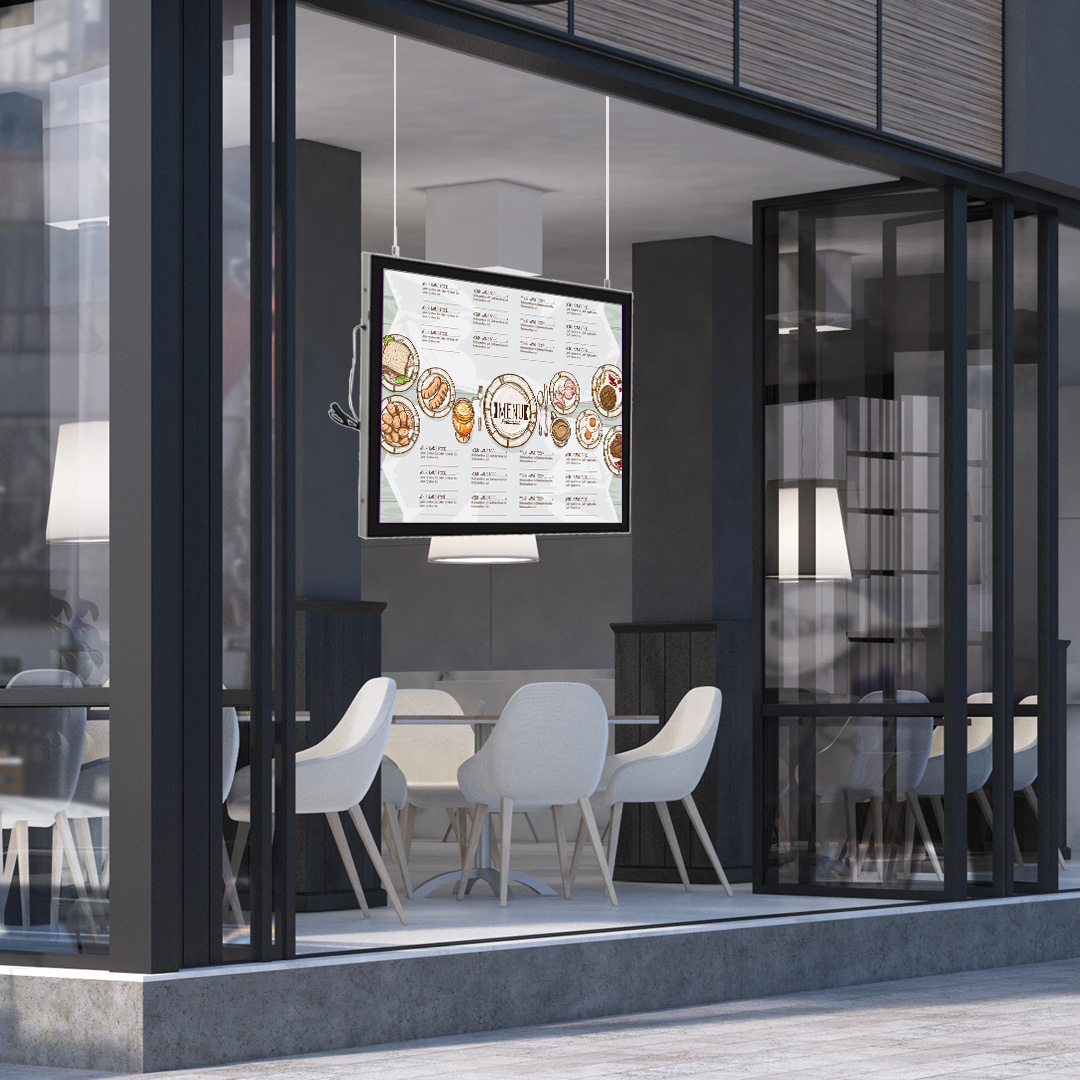 - 2 câbles acier 2 m + fixation sur cadre et au plafond pour modèles double-face.