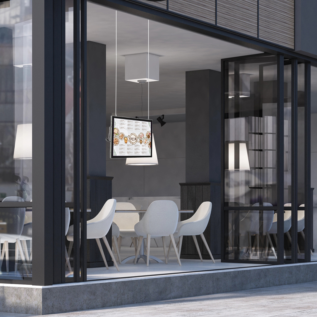 - 2 câbles acier 2 m + fixation sur cadre et au plafond pour modèles double-face.