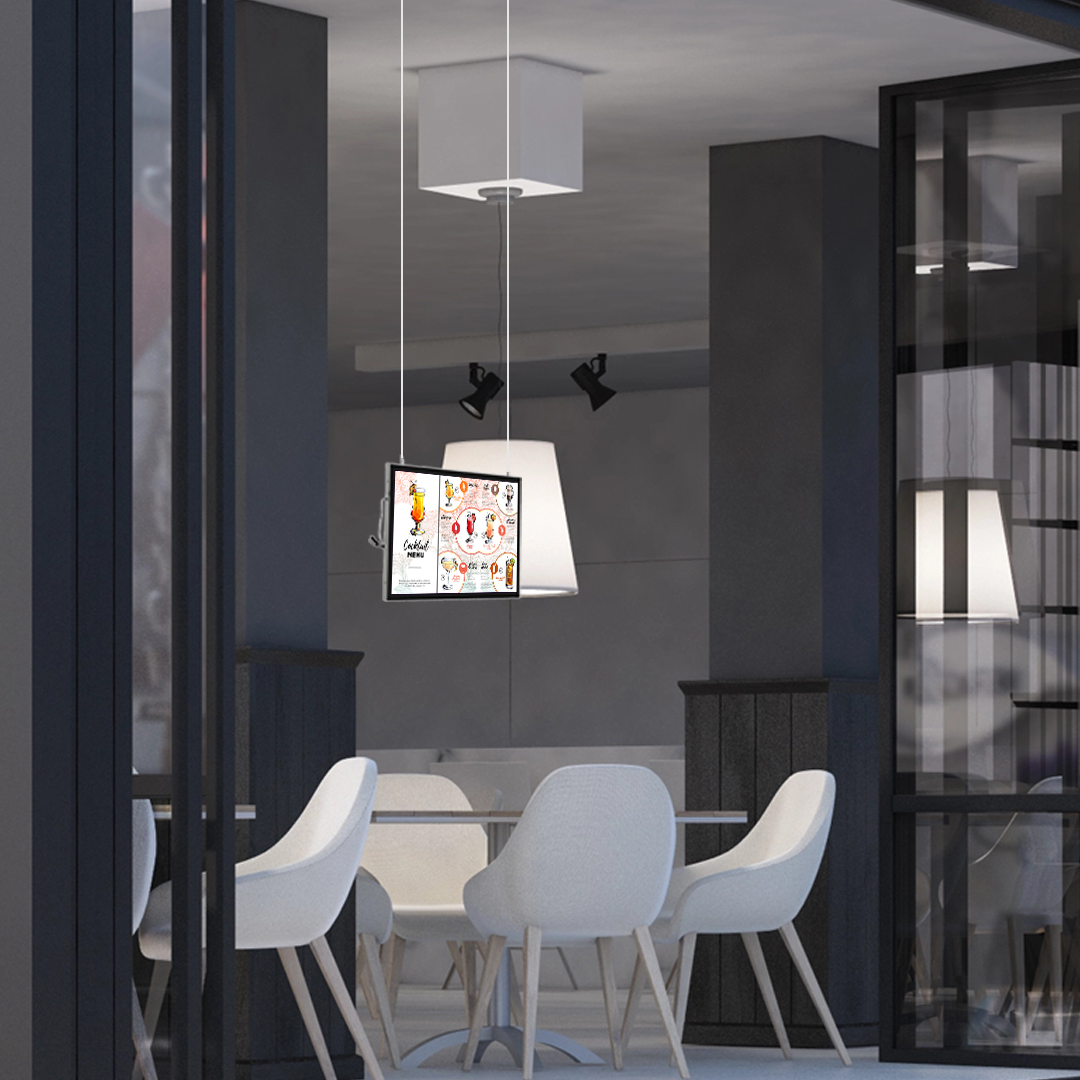 - 2 câbles acier 2 m + fixation sur cadre et au plafond pour modèles double-face.