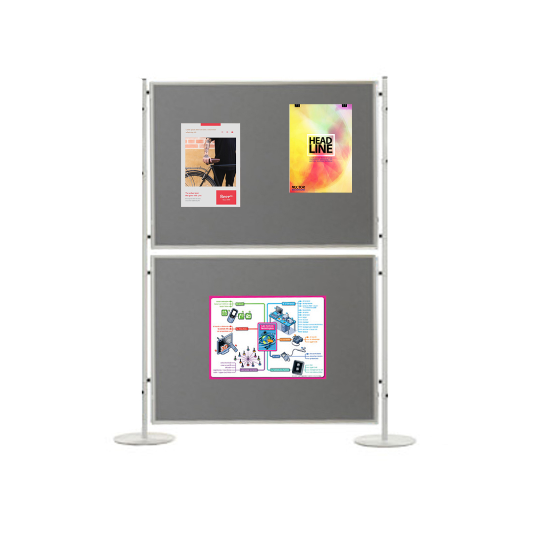 - Des panneaux double-faces, avec un cadre en aluminium anodisé naturel d’une épaisseur de 19 mm, avec : des panneaux feutrine punaisables, avec possibilité d’utiliser des pastilles velcro sur feutrine