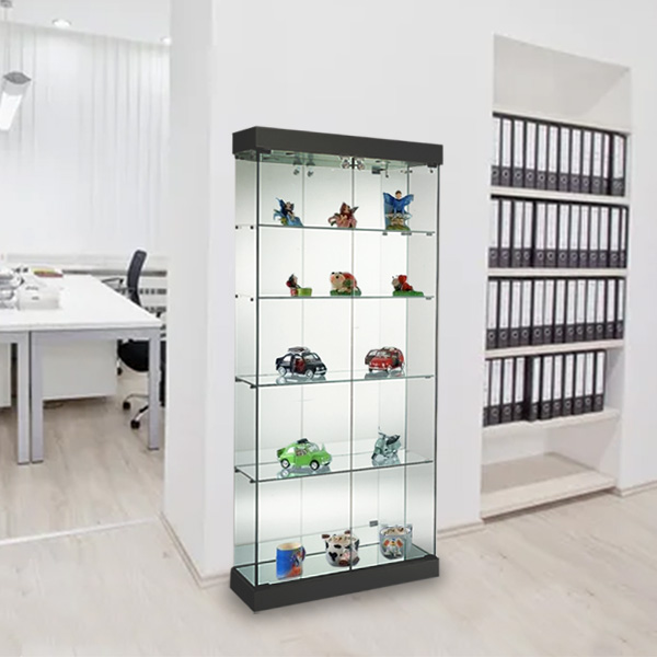 Vitrines transparentes avec deux spots LED pour la mise en avant des objets exposés.