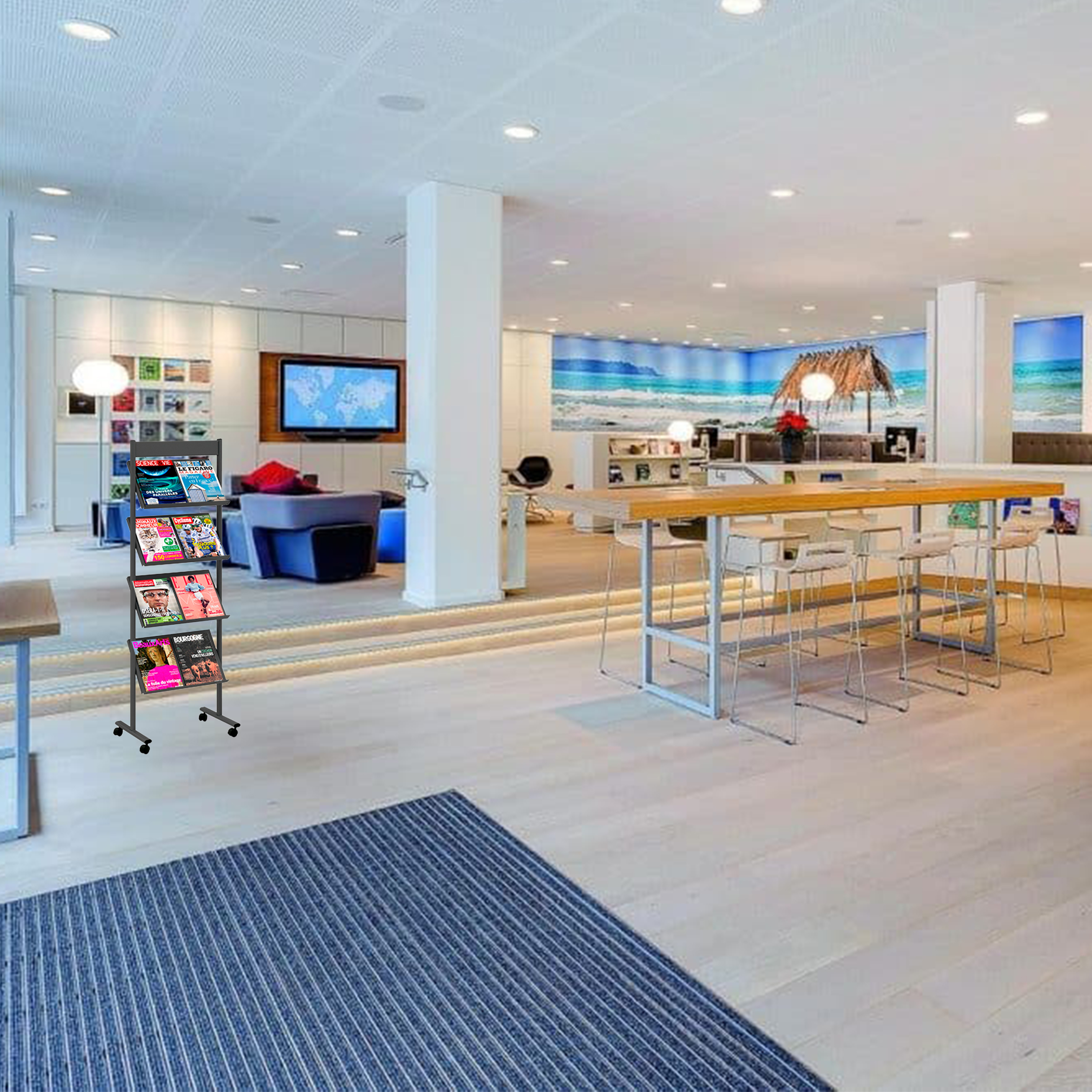 - Présentoirs composés de 4 étagères inclinées, fixes