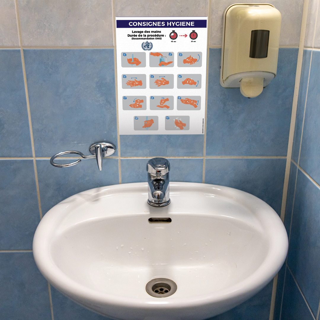 Panneaux d'affichage des règles et mesures d'hygiène. Conçus pour diffuser les bonnes pratiques de propreté à appliquer au sein des entreprises, écoles, commerces, collectivités...