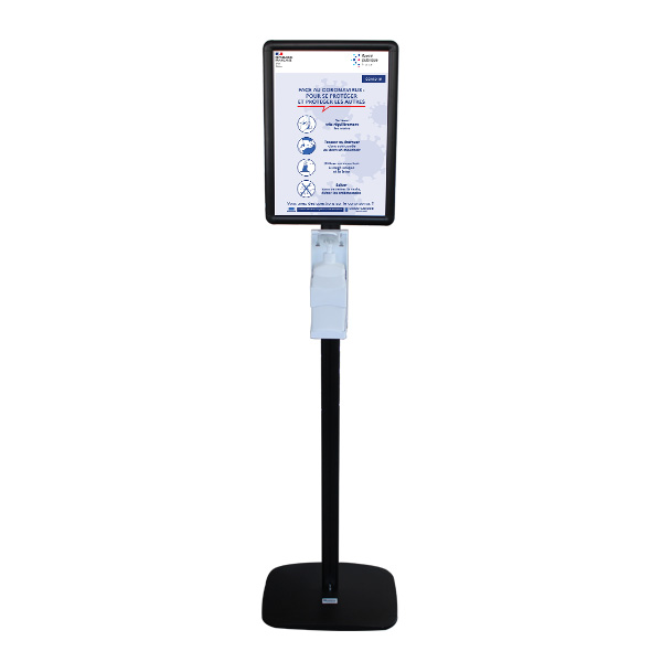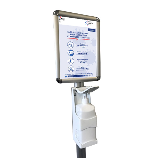 - Pompe-distributeur manuelle de gel fixée sur le poteau, hauteur réglable.