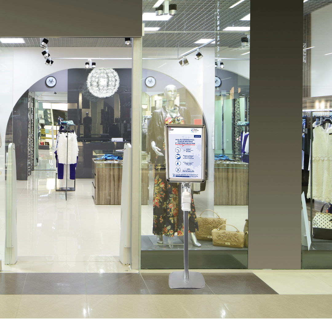 - Pompe-distributeur manuelle de gel fixée sur le poteau, hauteur réglable.