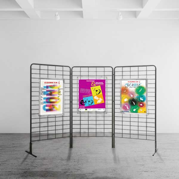 Grille métallique sur pieds pour l'exposition de cadres, affiches, supports de communication