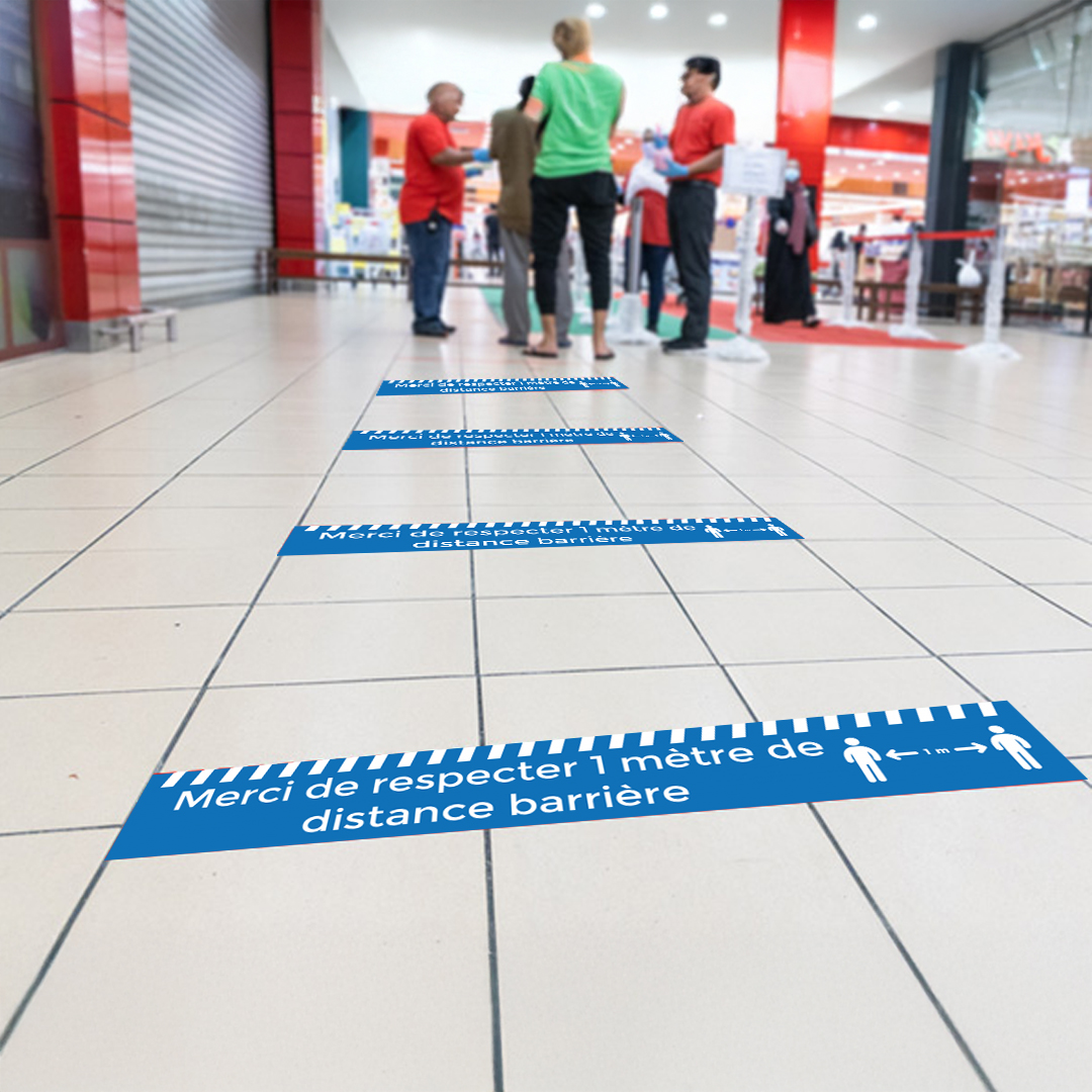 Bande de marquage au sol adhésive et antidérapante pour indiquer les distances de sécurité à respecter.
