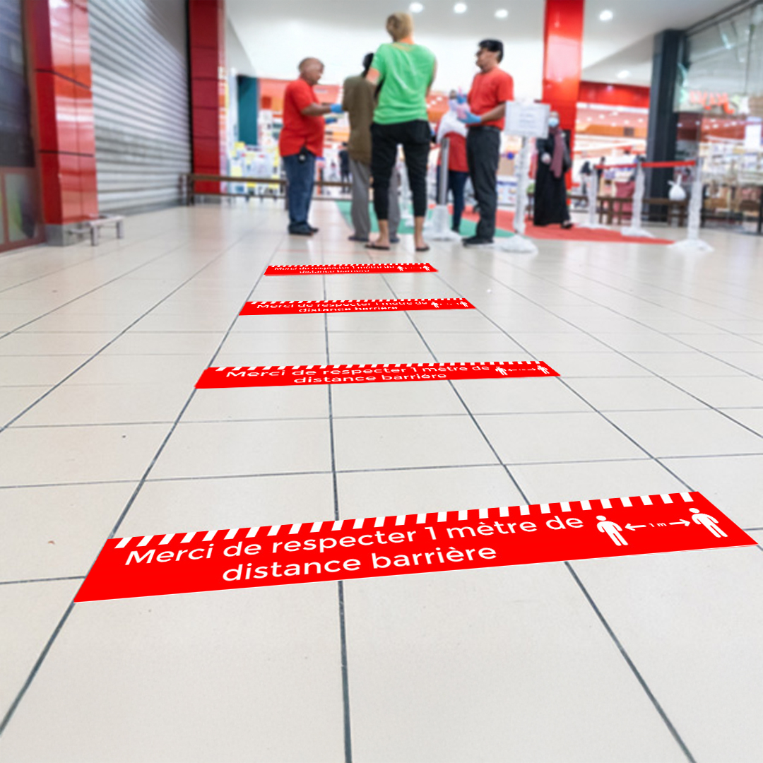 Bande de marquage au sol adhésive et antidérapante pour indiquer les distances de sécurité à respecter.